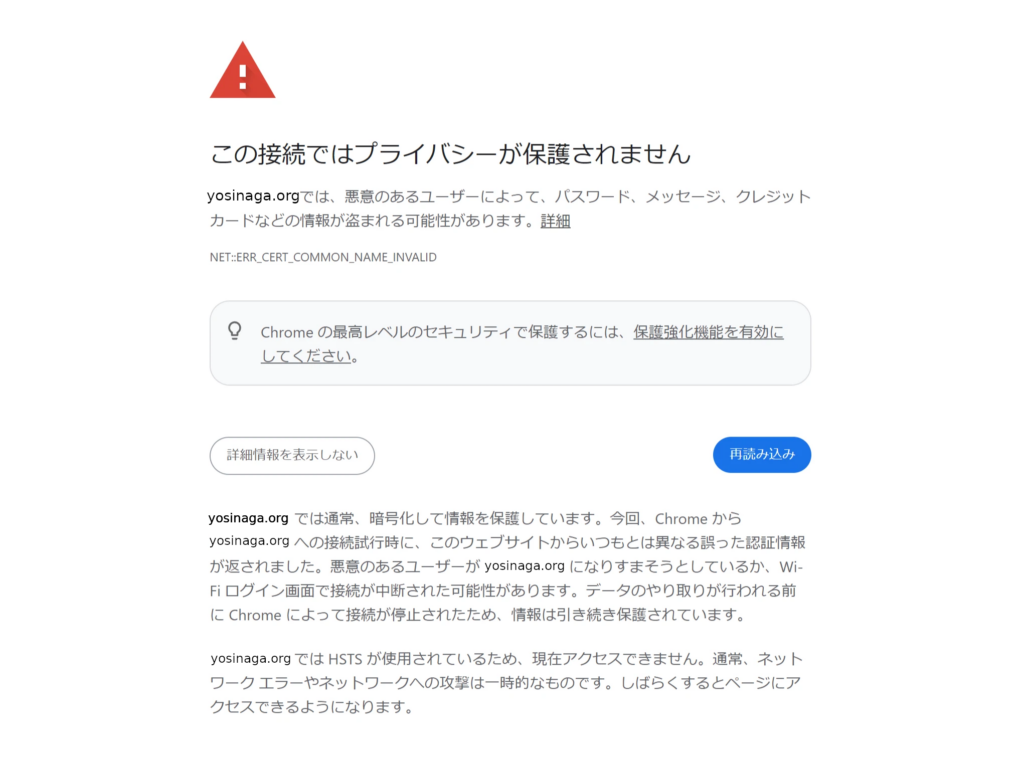 httpsの暗号化が確認できない? HSTSとはなんぞや? しばらく待ってみればアクセスできるかもしれないし、眠いので一晩置きましょう。
